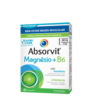 ABSORVIT® MAGNÉSIO B6 é um suplemento alimentar em comprimidos de rápida absorção que contém magnésio e vitamina B6. Esta associação sinérgica contribui para o normal funcionamento do sistema muscular, do sistema nervoso, da função psicológica e para o normal metabolismo produtor de energia.