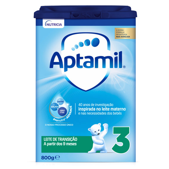 Aptamil 3 é um leite de transição, indicado para bebés a partir dos 9 meses de vida até ao final da lactância como parte de uma dieta diversificada.