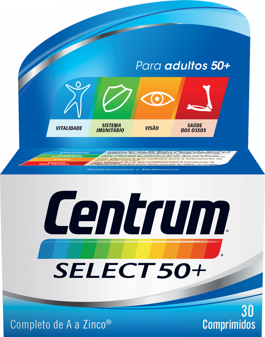 Centrum Select 50+ é um suplemento alimentar com multivitaminas, minerais e luteína, numa fórmula especialmente equilibrada, que o ajuda a manter-se saudável. Um comprimido de Centrum Select 50+ por dia complementa a alimentação, satisfazendo as necessidades de vitaminas e minerais de adultos com mais de 50 anos.