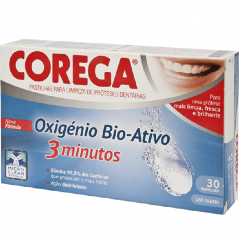 Corega Pastilhas de Limpeza Oxigénio Bio-Ativo. Limpeza profunda em 3 minutos. Elimina 99% das bactérias causadoras do mau hálito*. *em testes laboratoriaisCorega Pastilhas de Limpeza Oxigénio Bio-Ativo proporciona uma limpeza em 3 minutos. Elimina 99,9% das bactérias causadoras do mau hálito*. Para próteses dentárias e aparelhos ortodônticos. *em testes laboratoriais