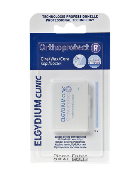ELGYDIUM CLINIC I ORTHOPROTECT Ceras Ortodônticas são barras de cera que se utilizam para revestir os brackets e outras peças dos aparelhos ortodônticos e assim proteger a mucosa oral e as gengivas contra a abrasão e pequenas lesões provocadas pelos mesmos. A cera é moldada e colocado sobre as estruturas dos aparelhos ortodônticos, especialmente nas partes aguçadas.
