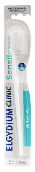 ELGYDIUM CLINIC SENSITIVE é uma escova de dentes concebida para uma escovagem eficaz, extra-suave dos dentes e gengivas sensíveis. As suas cerdas apresentam um forma cónica, com um diâmetro na base de 0,18 mm e diminui até atingir 0,01 mm na extremidade da cerda, garantindo uma escovagem excecionalmente suave.