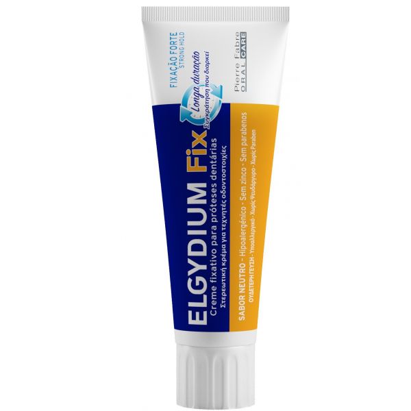 ELGYDIUM Fix Fixação Forte é um creme fixativo para as próteses dentárias, fácil de usar, que forma uma barreira contra partículas de alimentos e que é fácil de remover. O seu sabor neutro não afeta o paladar.