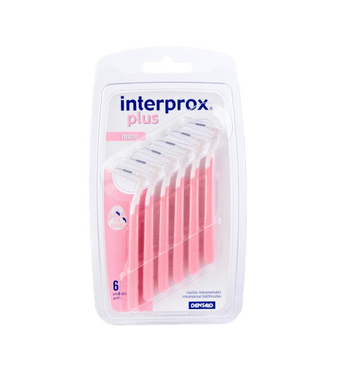 Interprox Plus Nano foi concebido para remoção do biofilme oral (placa dentária) acumulado nos espaços interproximais de 0,6 mm*, concretamente da zona pré-molar ou molar. O ângulo da cabeça facilita o acesso aos espaços interdentários na zona pré-molar ou molar. Este design específico permite uma entrada perpendicular, não provocando feridas nas gengivas. (PHD*=0,6)