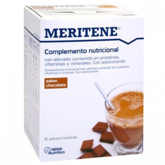 Leite magro, cacau em pó (8,9%), substâncias minerais (carbonato de magnésio, gluconato de zinco, pirofosfato férrico, selenito de sódio), triglicéridos de cadeia média, vitaminas (ácido ascórbico, nicotiramida, acetato de DL-alfa-tocoferilo, pantotenato de cálcio, cloridrato de piridoxina, cloridrato de tiamina, acetato de retinilo, riboflavina, ácido pteroilmonoglutâmico, filoquinona, colecalciferol, cianocobalamina), estabilizador (carragenina), edulcorante (sacarina de sódio), aroma, corante (beta-caroteno). Sem adição de açúcares. Pode ser incluído num plano alimentar com controlo de açúcares. Pode ser incluído numa dieta para diabéticos. Em caso de uso de suplementos de cálcio e vitamina D ou uso de anticoagulantes à base de cumarina, por favor consulte o seu profissional de saude. A gama de batidos MERITENE é isenta de glúten. Exceto o sabor descafeinado, que pode conter resíduos de glúten (<20 ppm).