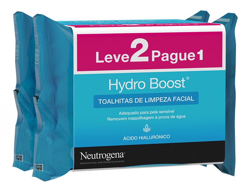 As Toalhitas de Limpeza Facial Hydro Boost® são únicas e suaves, impregnadas em loção de limpeza refrescante, deslizam facilmente pelo rosto e pelos olhos para remover impurezas e a maquilhagem. Removem maquilhagem à prova de água, ao mesmo tempo que reforçam a hidratação da pele. A Neutrogena® combina assim a sua tecnologia exclusiva de limpeza com um ativo hidratante e Ácido Hialurónico - componente natural da pele, que confere à fórmula a capacidade de reforçar e manter a hidratação cutânea. A pele fica limpa, fresca e suave. Adequado para pele sensível.