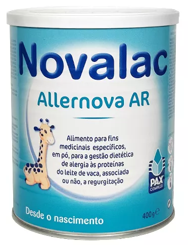Novalac Allernova AR é uma fórmula espessada, com proteínas extensamente hidrolisadas do leite de vaca (caseína), indicada para a gestão nutricional de alergia às proteínas do leite da vaca, associada ou não, a regurgitação, desde o nascimento em diante, podendo ser utilizado como fonte alimentar única até aos 6 meses, idade a partir da qual sob aconselhamento médico fará parte de uma dieta alimentar diversificada. Consumir sob supervisão médica.