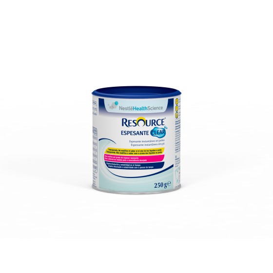 RESOURCE Espesante Clear é um espessante especialmente desenhado para espessar de forma rápida e prática líquidos, alimentos semissólidos e suplementos nutricionais para pacientes com disfagia ou dificuldades ao engolir. Uma vez preparado, o líquido ou alimento permanece transparente, sem grumos, sem sabor e sem odor. É um alimento dietético destinado a fins medicinais específicos utilizado para pacientes com disfagia, que deve ser utilizado sob vigilância médica. Transparente e sem sabor Espessa de forma prática e rápida Resistente à amilase Não continua a espessar Controlo total da vicosidade Pode ser preparado com antecedência Indicações Este produto está especialmente indicado para o tratamento de pacientes com dificuldades na deglutição: - Prevenção e tratamento da desidratação de pacientes com disfagia para líquidos. - Ajuda a conseguir as texturas adequadas em pacientes com disfagia para sólidos. Compatível com dietas para pacientes com disfagia e: Diabetes Mellitus, Excesso de peso e obesidade, Necessidades aumentadas de fibra, Baixa ingestão de sal.