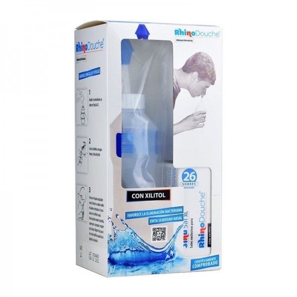 RhinoDouche Irrigação Nasal Garrafa + Sal XL Sais de irrigação com xilitol 26 Saqueta(s) 5 g