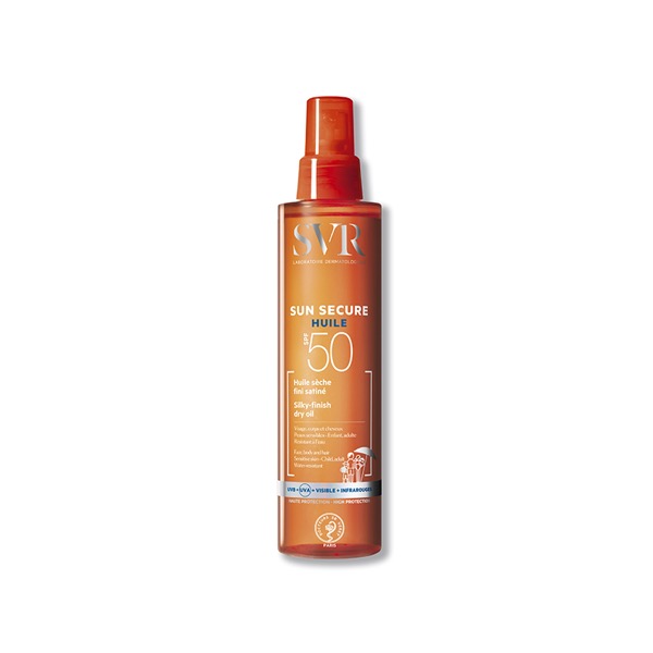 Óleo seco biodegradável acetinado SPF50, indicado para pele hipersensível ao sol. Adultos, rosto, corpo e cabelo.