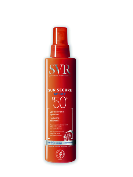 Spray hidratante ultra-leve invísivel SPF50+. Indicado para pele hipersensível ao sol: bebés, crianças e adultos, rosto e corpo.