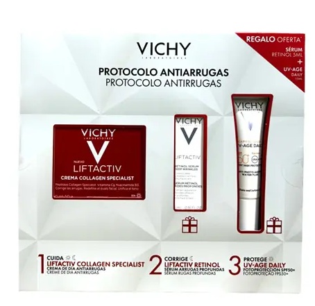 Coffret constituído por 3 cuidados Vichy: Vichy Liftactiv Collagen Specialist Creme de dia 50ml + Vichy Sérum Retinol 5ml + Vichy Capital Soleil UV-Age Daily Fluido SPF50+ 15ml.