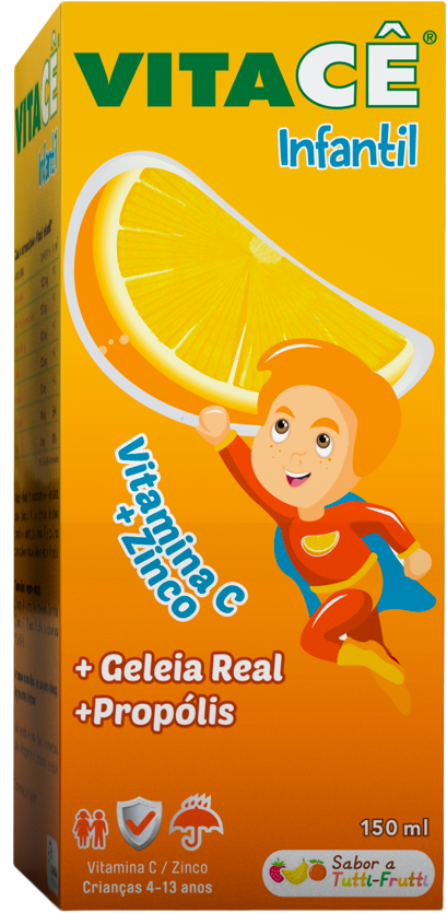 Vitacê® Infantil foi especialmente formulado para crianças, apresentando um agradável sabor a Tutti-frutti e uma fórmula avançada que combina o efeito da Vitamina C e do Zinco com os benefícios da Geleia Real e Própolis.Especialmente formulado para crianças (dos 4-12 anos), apresenta um agradável sabor a Tutti-frutti e uma fórmula avançada que combina o efeito da Vitamina C e do Zinco com os benefícios da Geleia Real e Própolis.