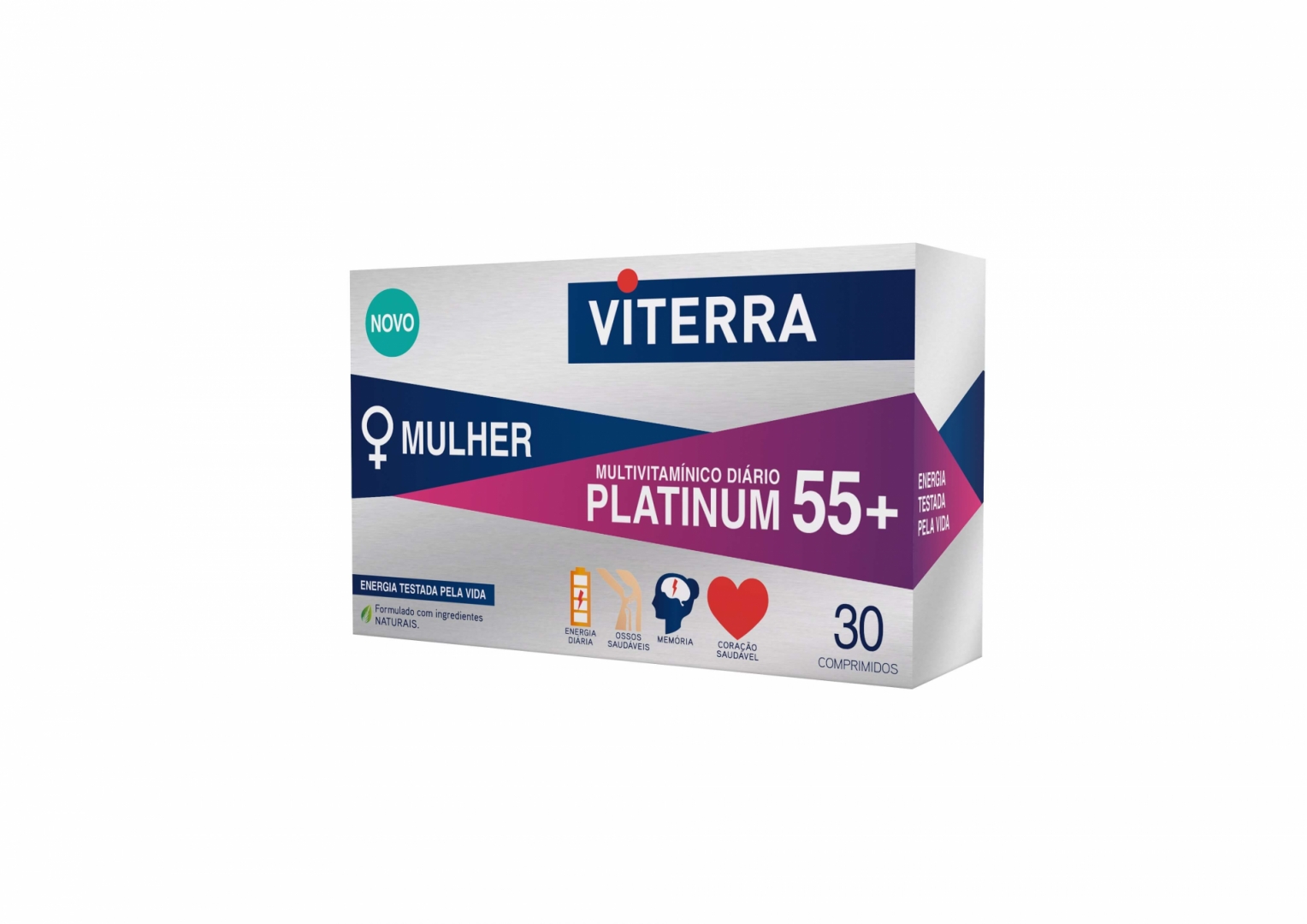 Viterra Platinum 55+ Mulher contém uma associação única de vitaminas e minerais, que fornece todos os benefícios mais importantes, ao mesmo tempo conferindo energia e vitalidade nesta fase tão especial e crucial no cuidado pós-menopausa.Contém uma associação única de vitaminas e minerais para um normal metabolismo produtor de energia, redução da fadiga e cansaço, manutenção de ossos normais e normal funcionamento do sistema nervoso e do coração.